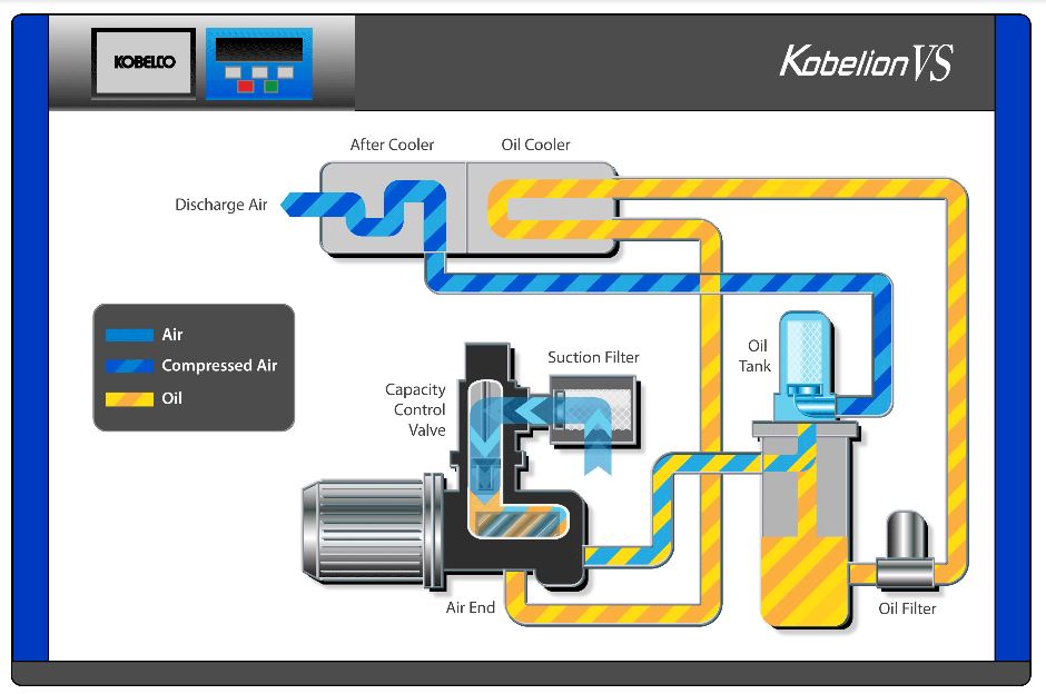 - Nguyên lí hoạt động chung của máy nén khí công nghiệp: Khi áp suất được tạo ra trong máy nén, phần năng lượng cơ học của động cơ điện hoặc là động cơ đốt trong được biến đổi thành năng lượng khí nén và nhiệt năng.
